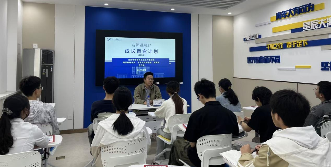 为帮助同学们明晰发展方向、提升综合能力,4月9日,“成长盲盒计划(第七期)”在蓝天书院社区顺利开展。河南省辅导员王强工作室成员、商学院辅导员白占俊深入社区,结合当下就业形势、教育环境与学生真实困扰,带领同学们开启一场直面困惑、明晰自我的成长探索之旅。活动伊始,白占俊以高等教育转型发展、就业市场竞争压力为切入点,结合自身工作与育人经验,指出学历竞争日趋激烈、过度依赖手机导致线下人际交往弱化,是当下...