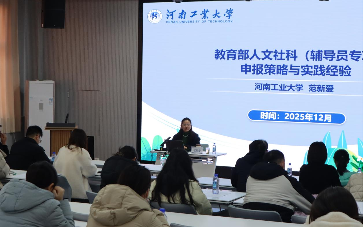 12 月 15 日下午,我校在东校区07B401心理情景剧场举办“教育部人文社会科学研究项目(高校辅导员专项)申报策略与实践经验”专题讲座,主讲人为河南工业大学化学化工学院党委副书记、工会主席范新爱副教授。本次讲座由党委学生工作部和蓝天书院联合主办,各学院党委(党总支)副书记、辅导员等相关人员参加。