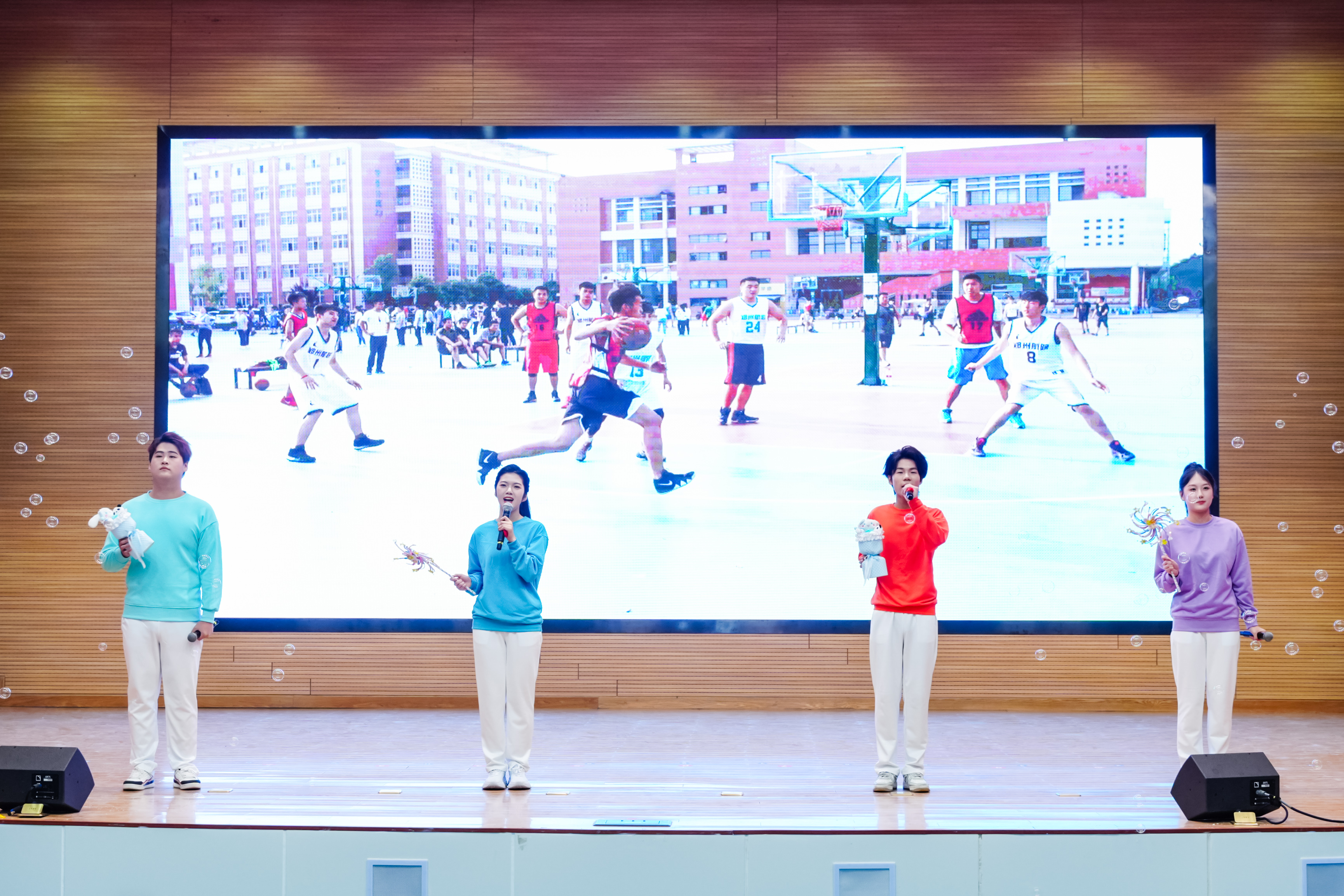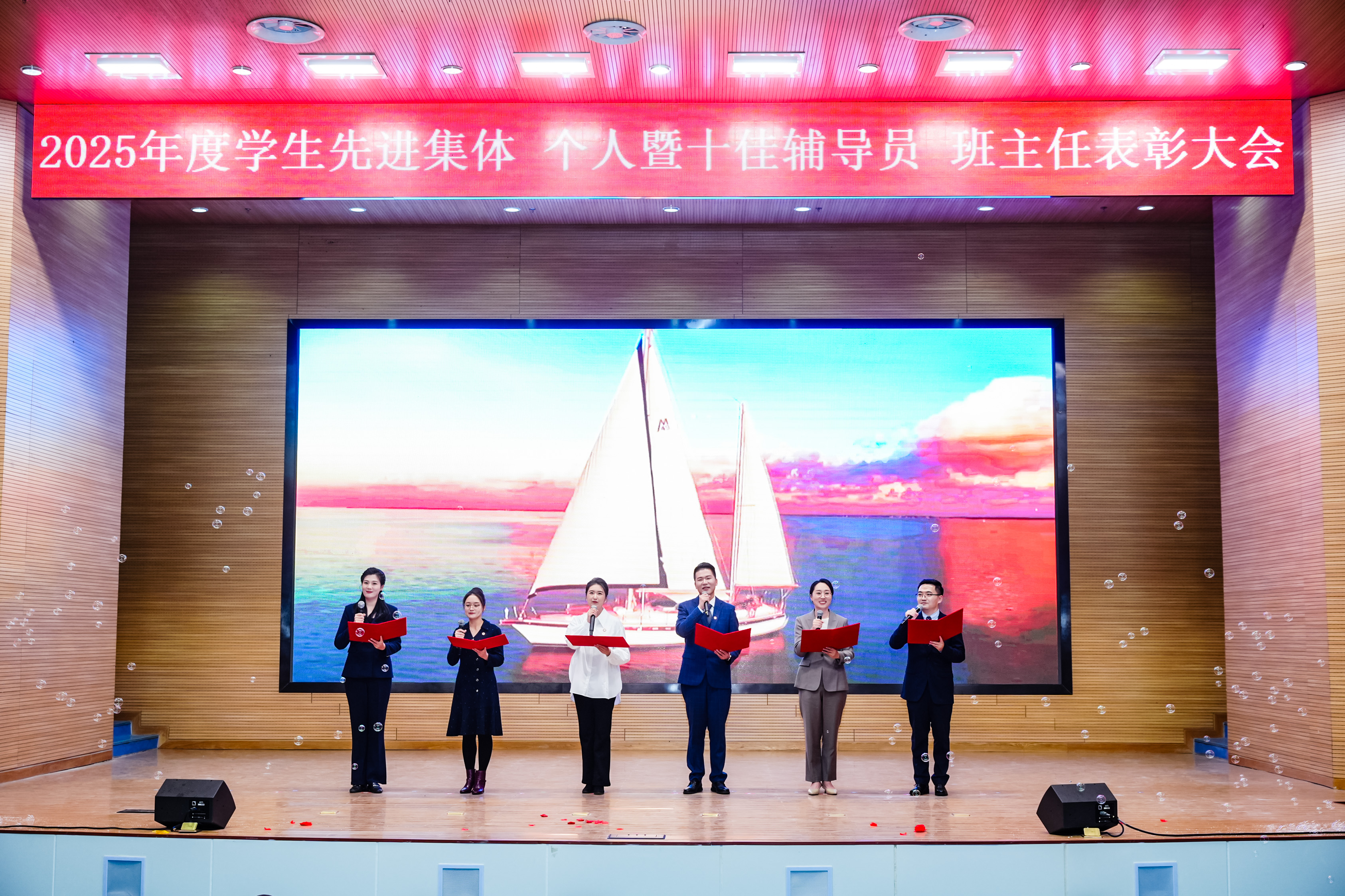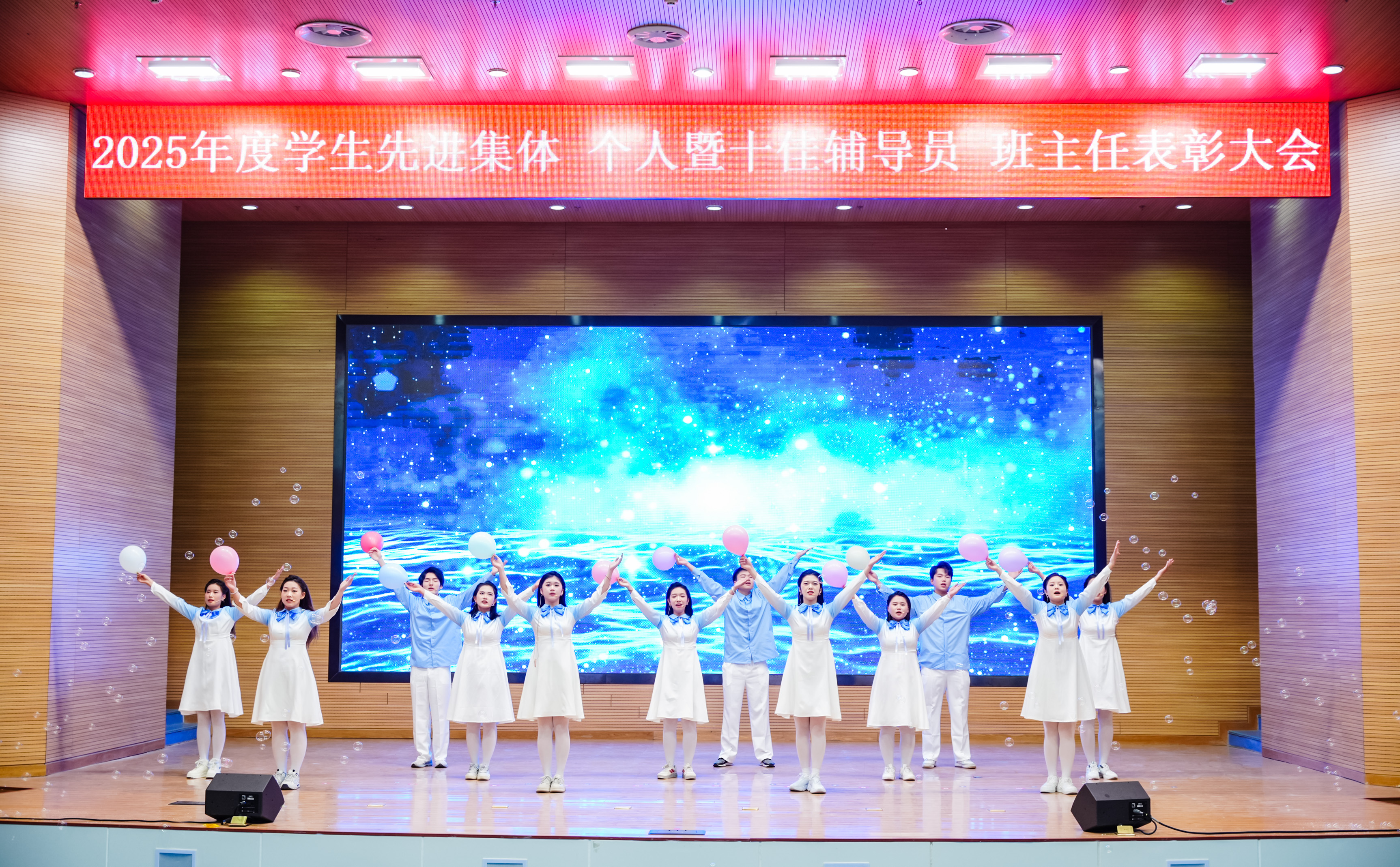本次大会分为“青春华章 榜样力量”和“匠心育人 师者荣光”两个篇章。大会在学生合唱《仰望星空》的激昂旋律中拉开序幕。