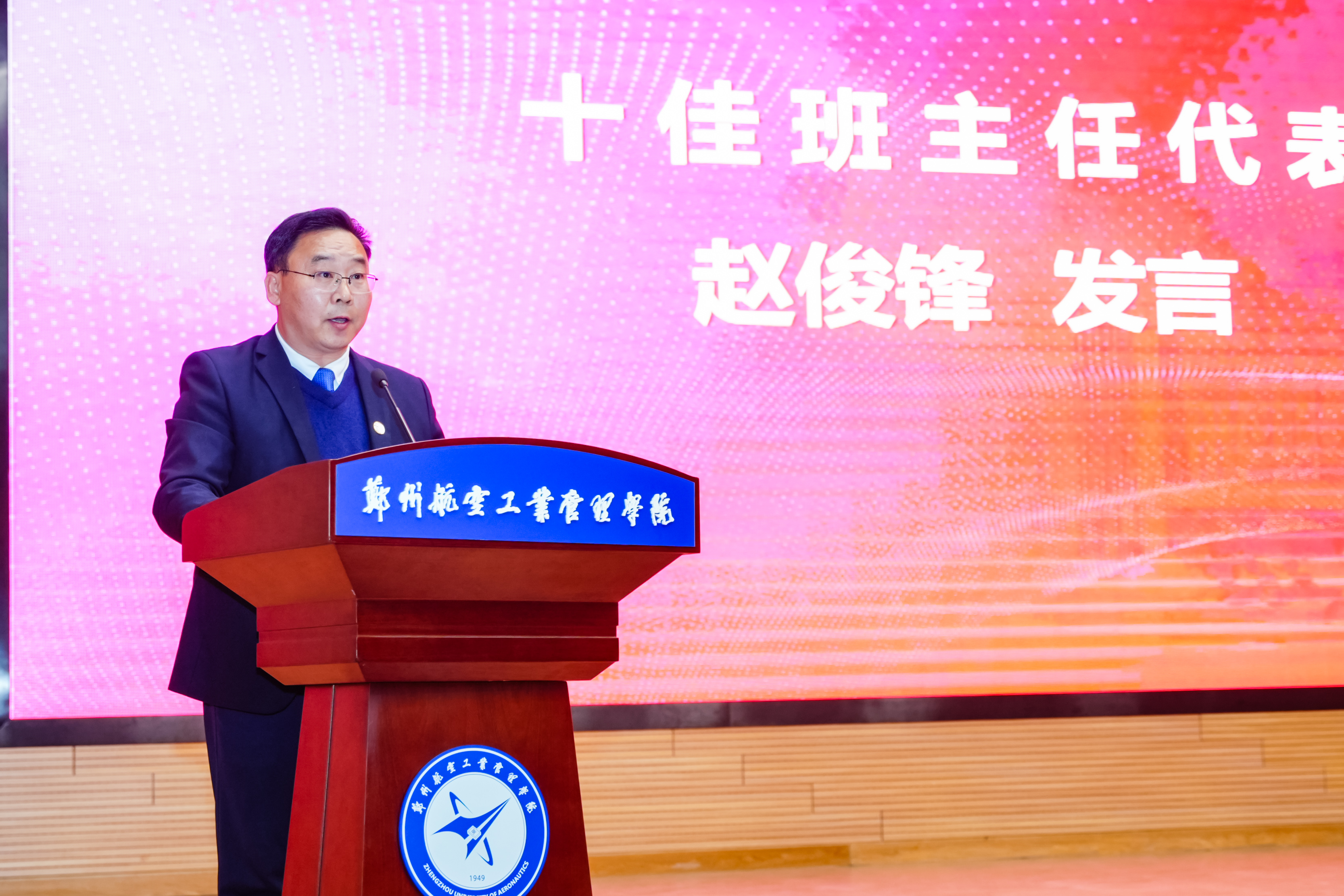 “十佳班主任”荣誉称号获得者赵俊锋作为获奖班主任代表发言。他表示,衷心感谢学校领导、相关部门和学工同仁的关心支持,他坚信师生关系是教育的永恒支点,今后将以对教育事业的坚守与热忱,厚植学生家国情怀,守护学生健康成长,以实际行动践行教育工作者的责任与担当,希望广大郑航学子眼里藏星光,心中有理想,肩上有家国,在郑航收获更好的人生风景,奔赴山海时,步履铿锵,终成不负韶华、不负时代的国之栋梁。