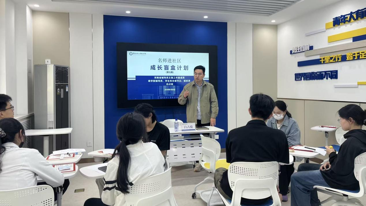 为帮助同学们明晰发展方向、提升综合能力,4月9日,“成长盲盒计划(第七期)”在蓝天书院社区顺利开展。河南省辅导员王强工作室成员、商学院辅导员白占俊深入社区,结合当下就业形势、教育环境与学生真实困扰,带领同学们开启一场直面困惑、明晰自我的成长探索之旅。