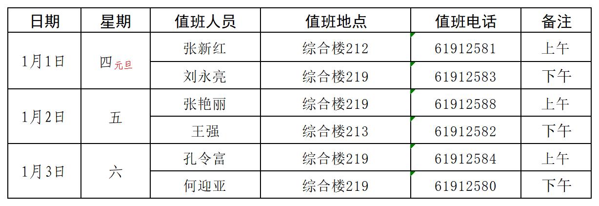 1.值班时间:上午8:30—12:00, 下午 14:30—17:00。2.值班人员要切实履行职责,坚守岗位,不得脱岗、串岗、误岗,保持24小时手机畅通。3.值班人员要做好值班记录登记。所有在值班期间处理的文件、来电、来访情况等,应当按要求签收和登记,涉密事项,严格按照保密规定办理。4.遇到突发情况,值班人员应及时处置,第一时间向部门领导及学校总值班室报告。学校总值班室电话:61911000。5.值班期间注意加强安全防范,下班时注意锁门,关闭电源。