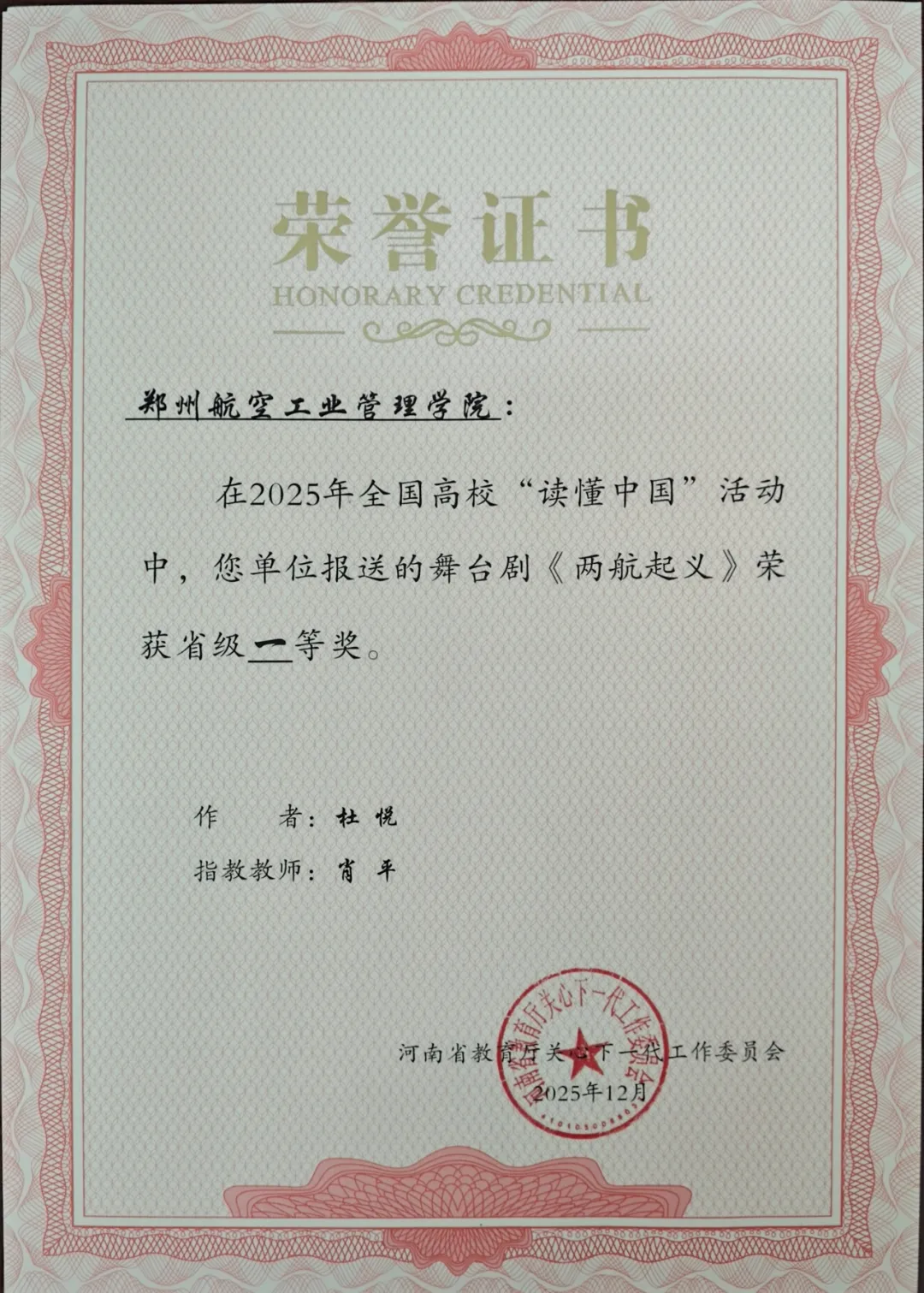 近日,2025年度高校“读懂中国”活动获奖名单正式公布。由民航学院话剧团精心创排的舞台剧《两航起义》,从众多优秀作品中脱颖而出,荣获省级一等奖。