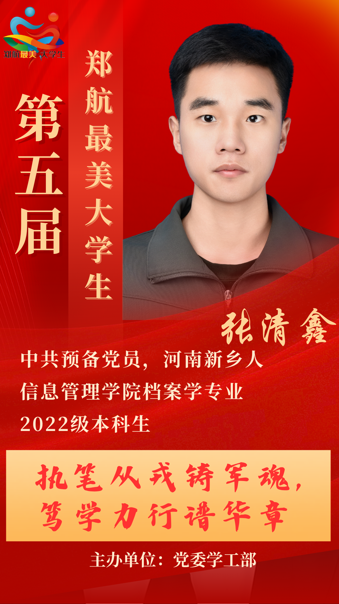 张清鑫,男,中共预备党员,河南新乡人,信息管理学院档案学专业,2022级本科生。