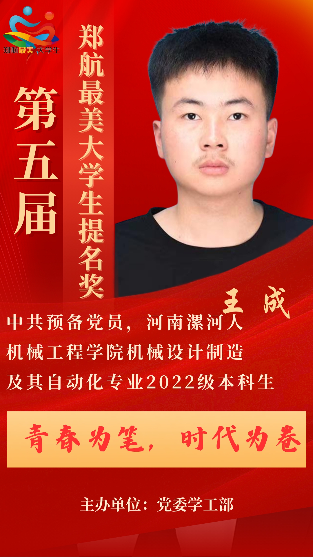 今天,让我们一起领略第五届郑航“最美大学生提名奖”之机械工程学院王成的青春风采吧!
