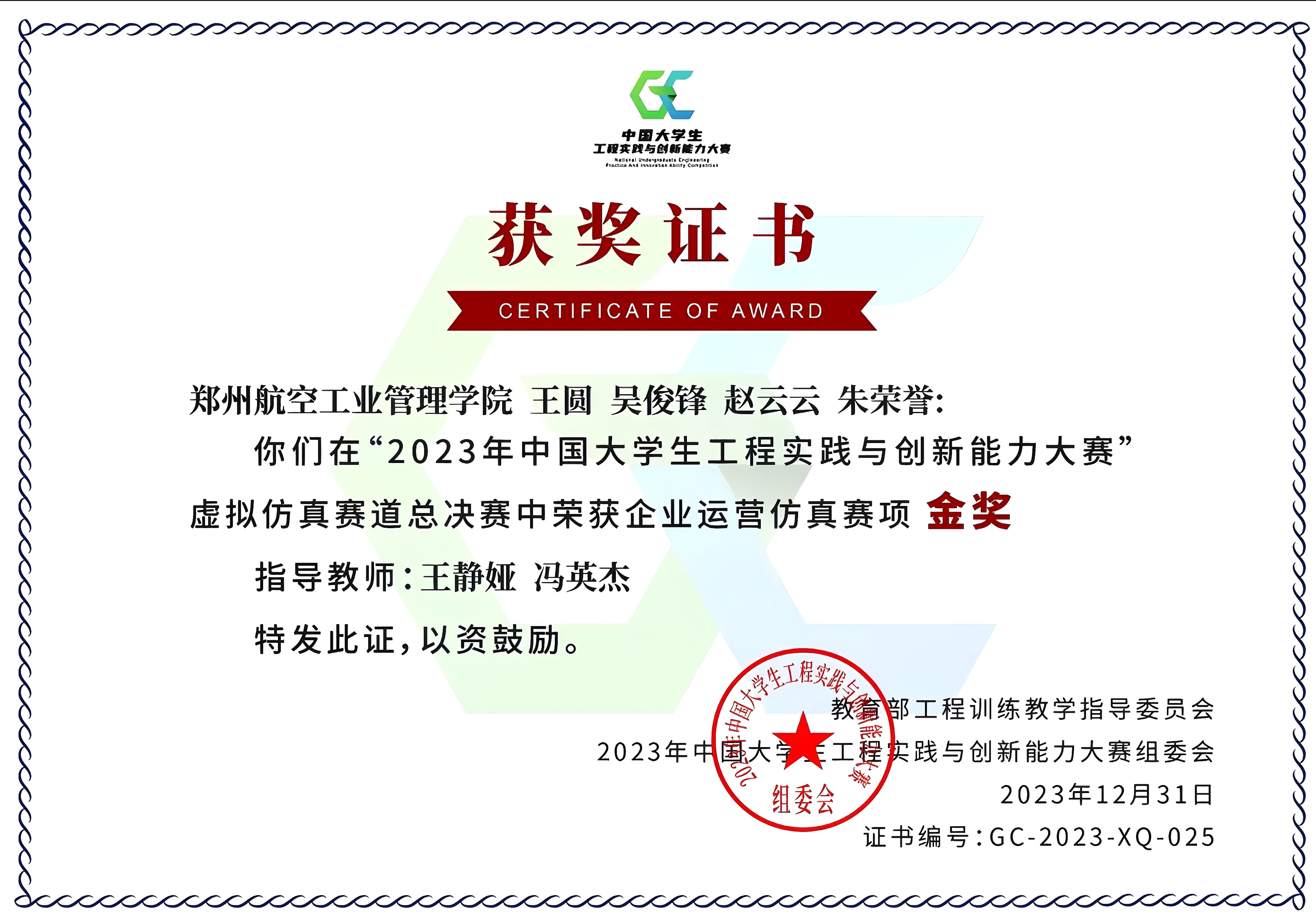 2023年,朱荣誉参加了中国大学生工程实践与创新能力大赛企业运营仿真竞赛。凭借扎实的专业知识和创新思维,朱荣誉深入研究企业运营的各个环节,优化生产流程、供应链管理和市场营销策略,带领团队一路过关斩将,在激烈的竞争中脱颖而出,荣获全国金奖。