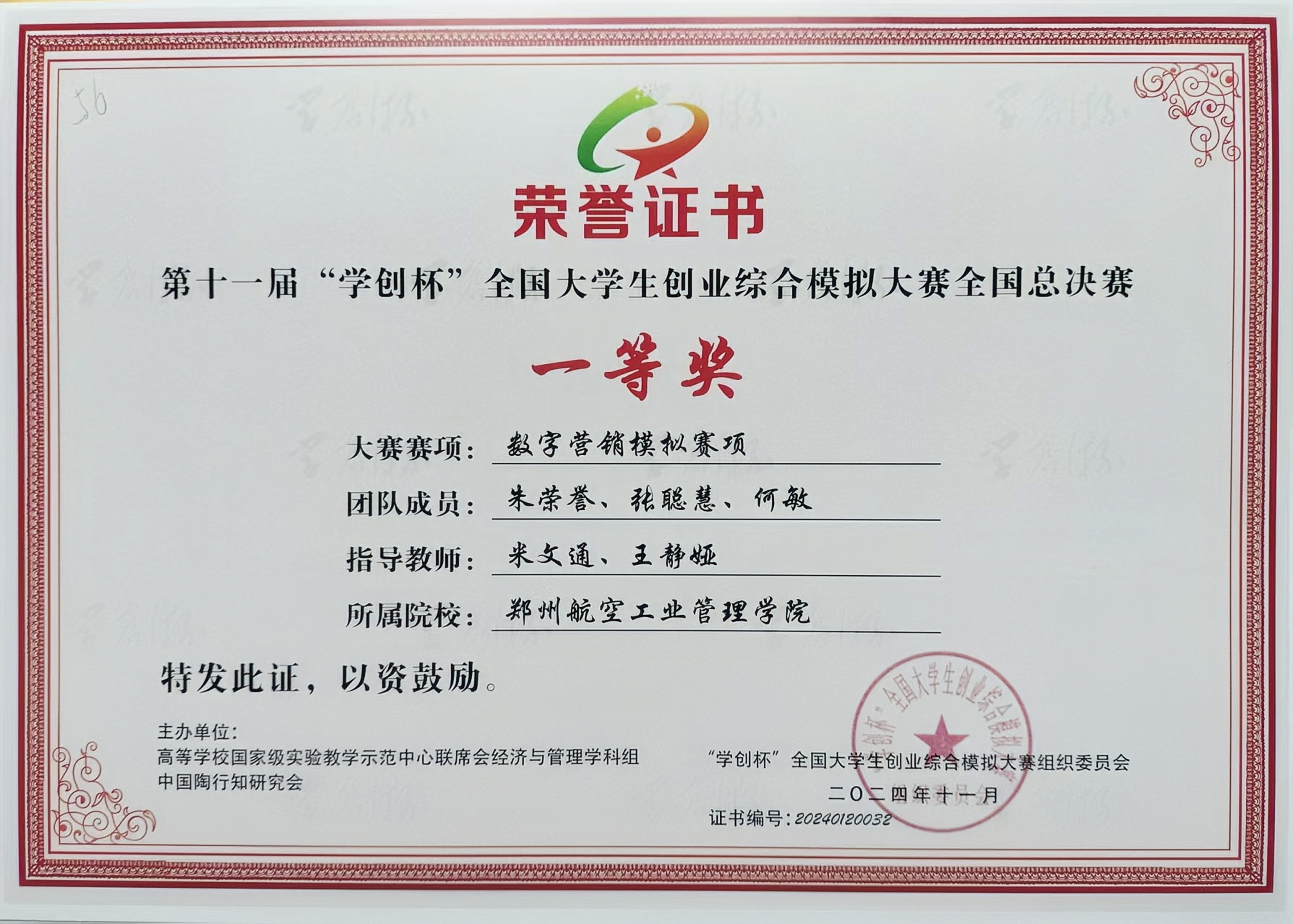 2024年,朱荣誉参加了第十一届“学创杯”全国大学生创业综合模拟大赛数字营销赛项。比赛中,他充分发挥创新思维和商业洞察力,带领团队制定了独特的创业策略,并且通过创新产品和服务以及有效的团队协作和资源整合,最终荣获全国总决赛一等奖。