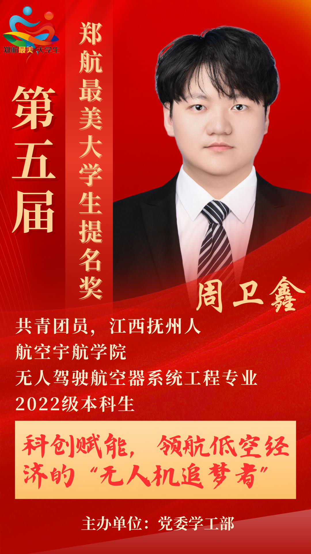 今天,让我们一起领略第五届郑航“最美大学生提名奖”之航空宇航学院周卫鑫的青春风采吧!