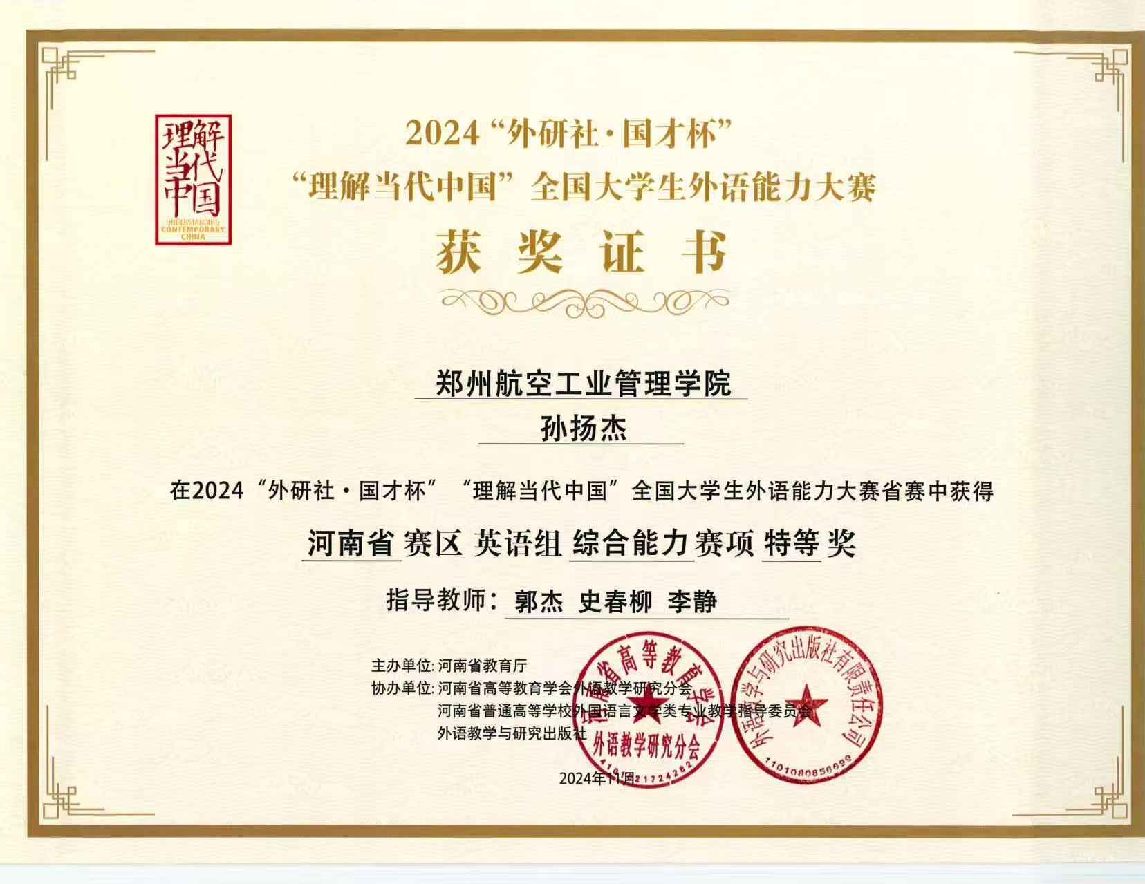 孙扬杰同学始终以高标准严格要求自己,笃志勤学、锐意进取,不仅在学业上追求卓越,更在学科竞赛、社会实践、志愿服务与国际交流中勇担重任、绽放光彩,以实际行动践行“严谨、求实、开拓、进取”的校训。他学习成绩优异,入学以来平均学分绩点3.86,英语专业四级、国际人才考试等专业能力考试等级均为“优秀”,连续两年荣获校级一等奖学金、三好学生、优秀团员等荣誉,并于2025年6月荣获“河南省三好学生”称号;深耕学科竞赛,累计斩获国家级奖项2项、省级奖项4项、校级奖项10余项;曾任第四届“讲好河南故事”外语演讲大赛河南省决赛、第30届“21世纪杯”全国英语演讲比赛校园选拔赛等外语赛事双语主持人;投身志愿服务和社会实践超120小时,策划的科技馆科普活动、新华书店阅读活动惠及千余人次,被学校评为寒假社会实践先进个人;参与国际组织IIE实习,积极传播中华优秀传统文化。