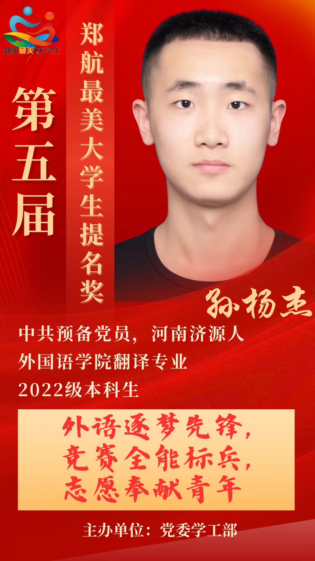 孙扬杰,男,河南济源人,中共预备党员,外国语学院翻译专业2022级本科生。